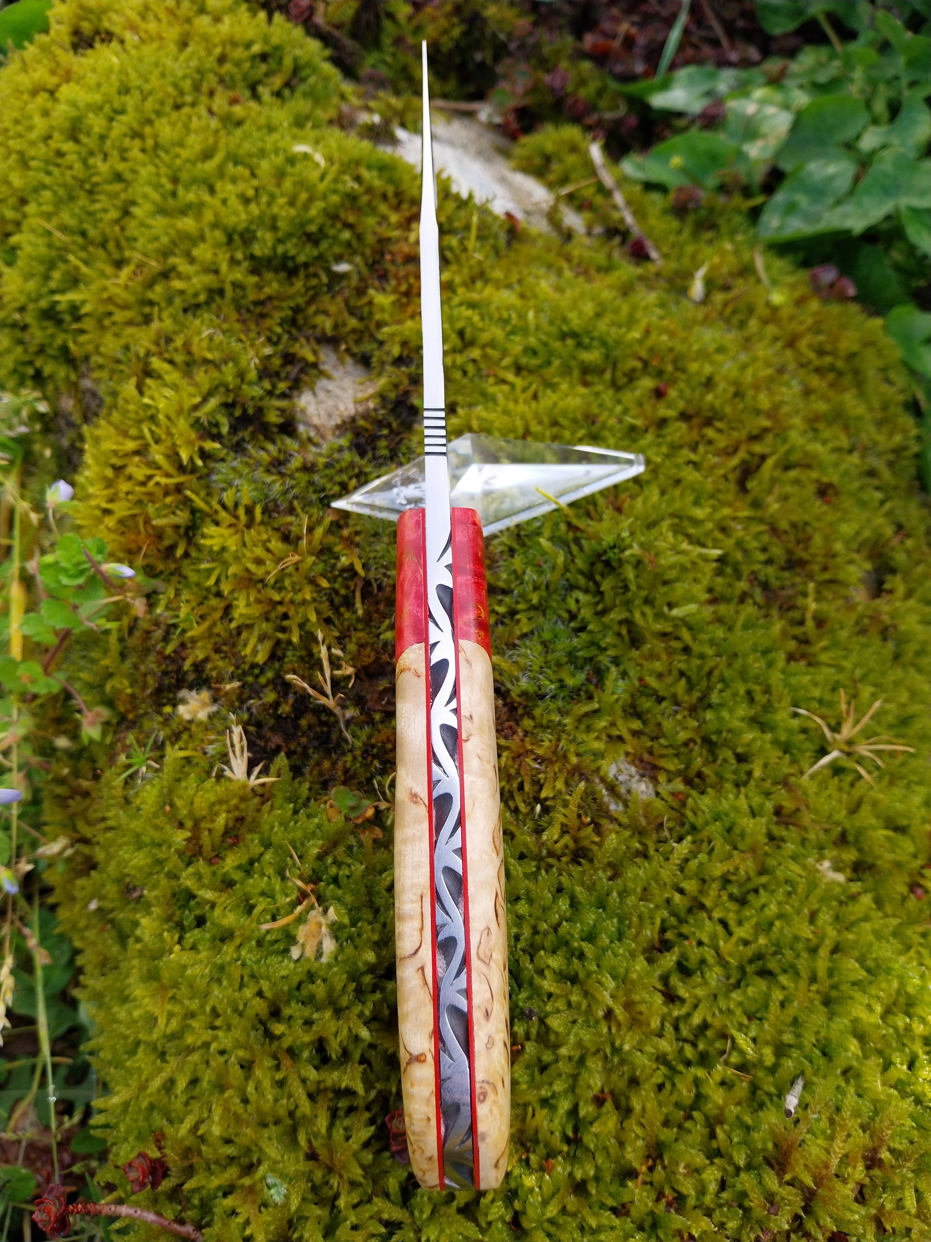 Manche en loupe bouleau madré stabilisé, pièce unique et élégante, fabriquée à partir de matériaux variés . Les motifs créés ainsi que la méthode de montage, offre ainsi un bel équilibre entre fonctionnalité et esthétique.