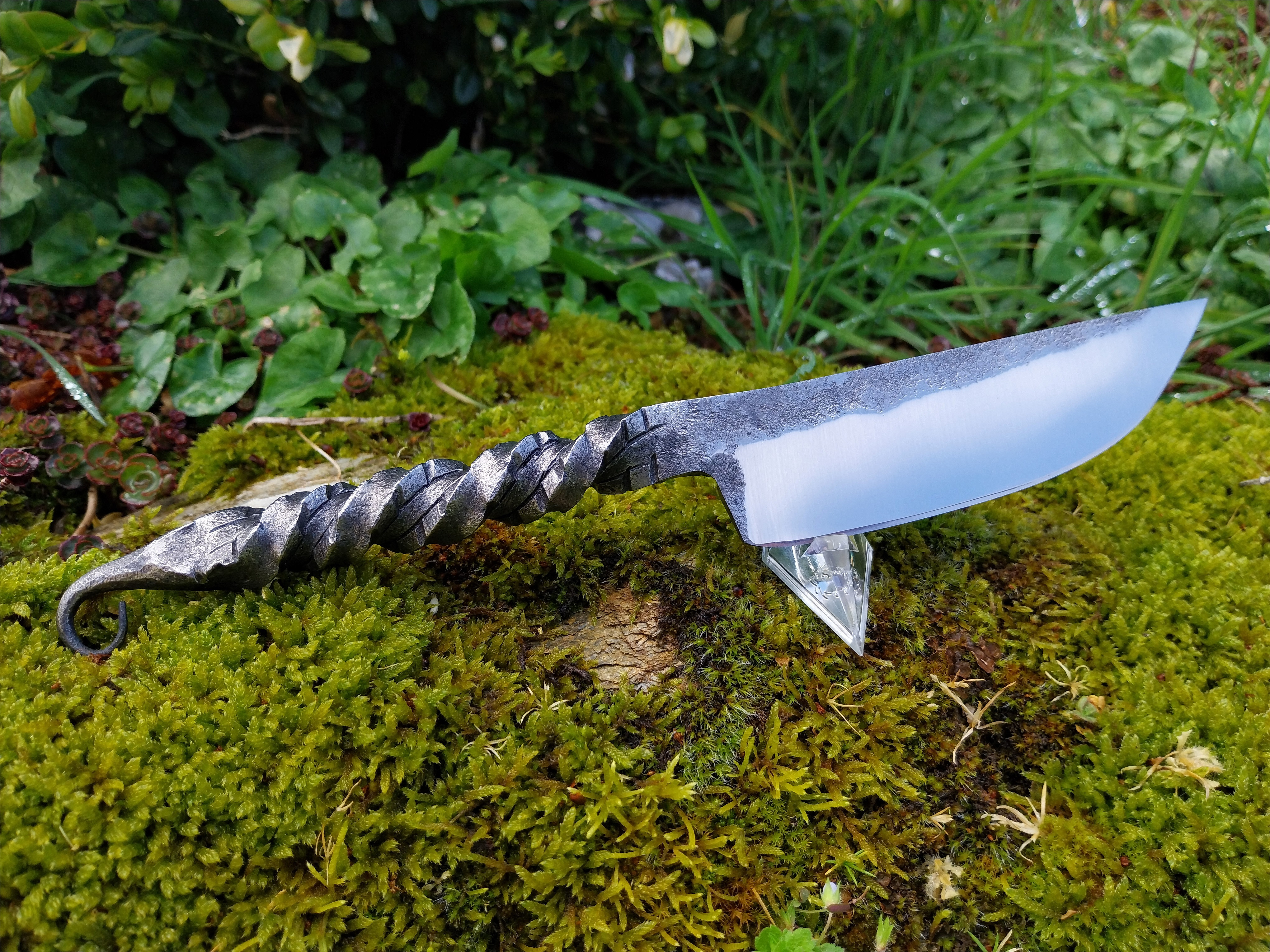 Manche torsadé à chaud durant la forge , pièce unique et élégante. Les motifs créés ainsi que la méthode de montage, offre ainsi un bel équilibre entre fonctionnalité et esthétique.