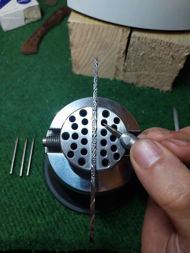 La lame, forgée en acier damassé , révèle au regard un travail de métallurgie traditionnel, guillochée en « cordage », pour unir la mémoire passée et présente.